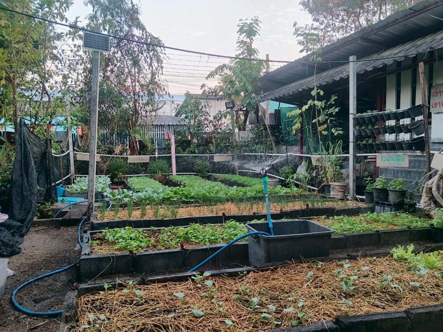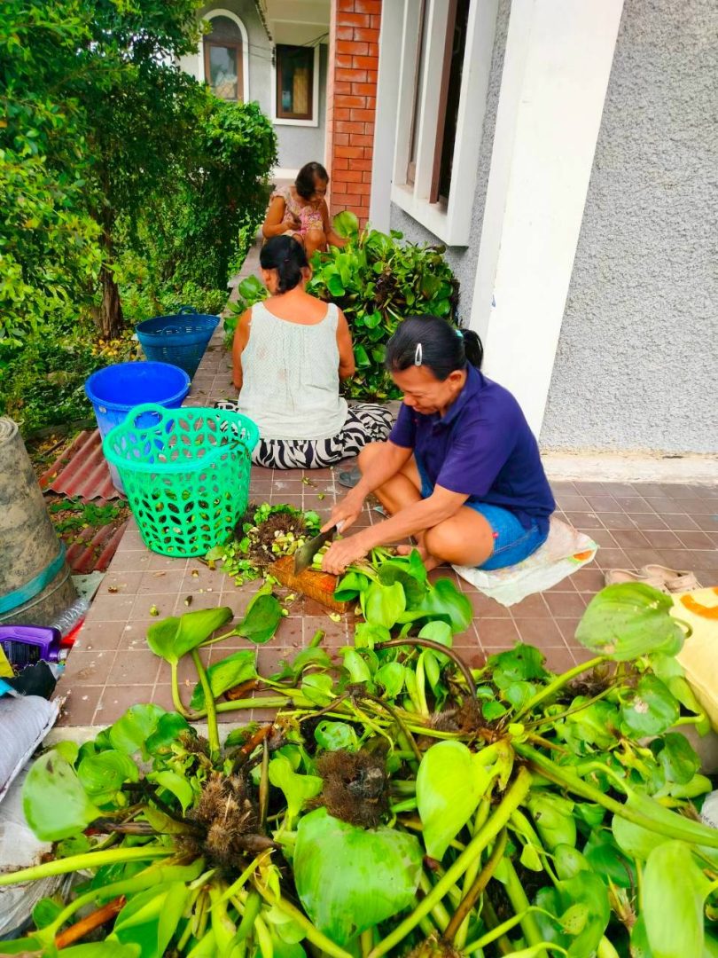 ในการปลูกผักอินทรีย์ ชุมชนที่นี่สามารถลดค่าใช้จ่ายในการซื้อดิน ด้วยการนำผักตบชวาซึ่งเป็นวัสดุที่มีในชุมชนมาใช้แทนกาบมะพร้าวที่มีราคาแพง โดยนำมาสับแล้วหมักลงแปลง