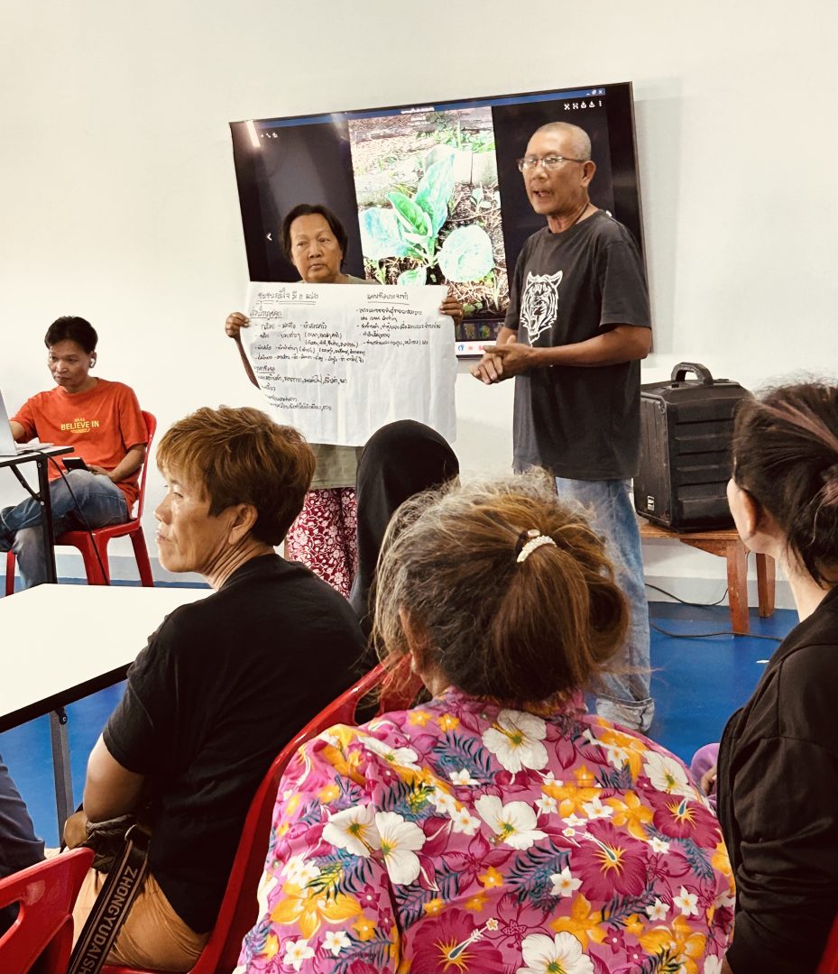 หน่อย-วรรณา กล่าวว่า การประชุมครั้งนี้เราใช้การอบรมเพื่อยกระดับคนทำงานทำหน้าที่พี่เลี้ยงสอนกันเอง หลังจากผ่านการอบรมกับอาจารย์เติ้ล โดยเลือกกิจกรรมที่เขาทำอยู่แล้ว อย่างเช่น “แจ็ค” ที่มีทักษะพัฒนาสูตรอาหารพืชและสมุนไพรกำจัดแมลงได้ด้วยตัวเอง เกิดจากการเรียนรู้ ทดลอง ใช้ซ้ำ ค่อย ๆ ปรับสูตรจนลงตัวเป็นเวลาเกือบ 10 ปี ก่อนนำมาถ่ายทอดต่อ และ “พี่มล” จากชุมชนพูนทรัพย์ ซึ่งทำฮอร์โมนหน่อกล้วยมาตลอด ดวยเหตุที่ว่าเป็นวัสดุที่หาได้ง่ายในชุมชน
