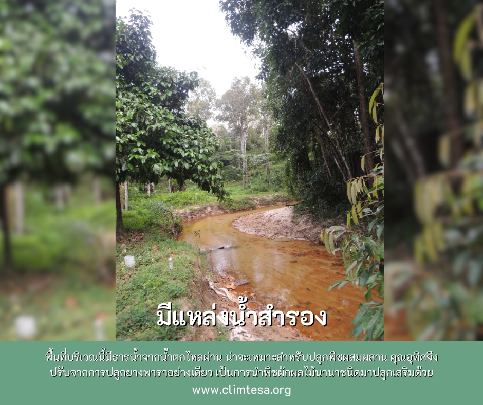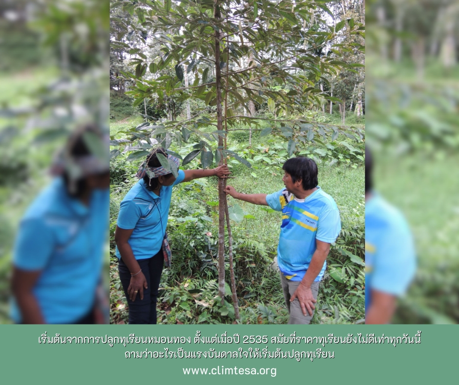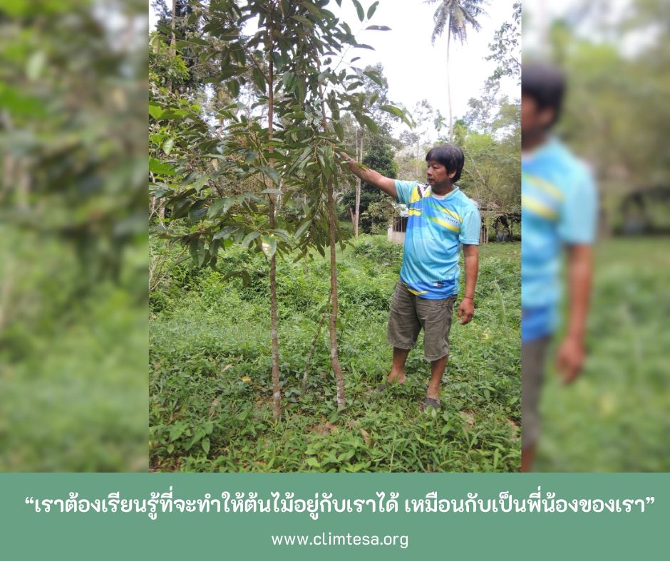 คุณอุทิศอธิบายว่า ทุเรียน ถ้าเราปลูกเดี่ยวๆ เขาจะตาย ต้องปลูกร่วมกับพืชอื่นด้วย นอกจากนี้ยังมีเรื่องของลมที่ต้องรับมือ การปลูกผสมผสานก็มีส่วนช่วยให้ต้นไม้แต่ละชนิดช่วยกันรับมือกับลมที่ถาโถมเข้ามาได้