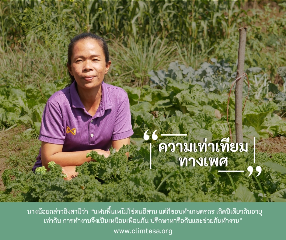 “แฟนพื้นเพไม่ใช่คนอีสาน แต่ก็ชอบทำเกษตรกร เกิดปีเดียวกันอายุเท่ากัน การทำงานจึงเป็นเหมือนเพื่อนกัน ปรึกษาหารือกันและช่วยกันทำงาน”